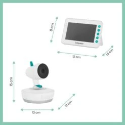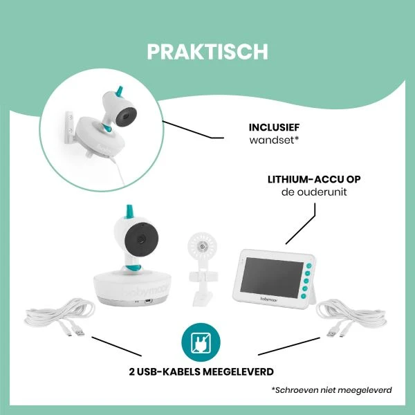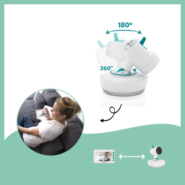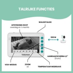 De Babymoov Yoo Moov Babyfoon is uitgerust met de meest handige functies en nieuwe technologie. Op deze manier kan je als ouder je kindje perfect in de gaten houden. Het beeldscherm wordt inclusief camera en ophangset geleverd zodat je de camera zowel op de kast kan zetten als op de muur bevestigen. Het beeldscherm beschikt over een helder en groot beeld waarmee je alles helder en duidelijk kan zien, zelfs in het donker. Met de knopjes op het scherm kan je de camera 360 graden draaien, omhoog of omlaag laten kijken, in- en uit zoomen en de kamertemperatuur meten. Is je kindje erg onrustig of ligt het te huilen? Dankzij de terugspreekfunctie kan je je kindje op een afstand gerust te stellen. Als je kindje in diepe rust is gaat de babyfoon uit en wanneer er een geluid gesignaleerd wordt springt hij weer aan dankzij de VOX functie. Verder heeft de babyfoon een bereik van 300 meter en is de camera uitgevoerd met nachtverlichting in 7 verschillende kleuren.