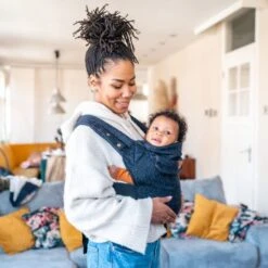 Draag je op je buik dan zijn de schouderbanden gekruist erg comfortabel, bij rugdragen is dit minder fijn maar heb je een bijgesloten verbindingsbandje die ervoor zorgt dat de schouderbanden niet zullen afzakken. Ook kan je het verbindingsbandje gebruiken om het rugpand te versmallen voor pasgeborenen, draag de stof van knieholte tot knieholte.