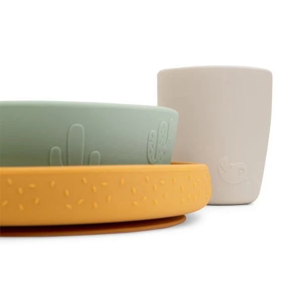 Met de Done by Deer Lalee Stick & Stay Dinerset heb je een leuke dinerset voor de eerste maaltijden van je kindje. De set bestaat uit een bordje, kom en mokje. Doordat alle items zijn voorzien van antislip kan je kindje zelfstandig leren eten zonder dat het bordje van tafel wordt verschoven of wordt omgegooid. Het vrolijke ontwerp en de verschillende kleurtjes zorgen ervoor dat het voor je kindje leuk blijft om te eten. Daarnaast is de dinerset vaatwasser en magnetron bestendig. Verder is deze leuke set gemaakt van siliconen waardoor het wel tegen een stootje kan.